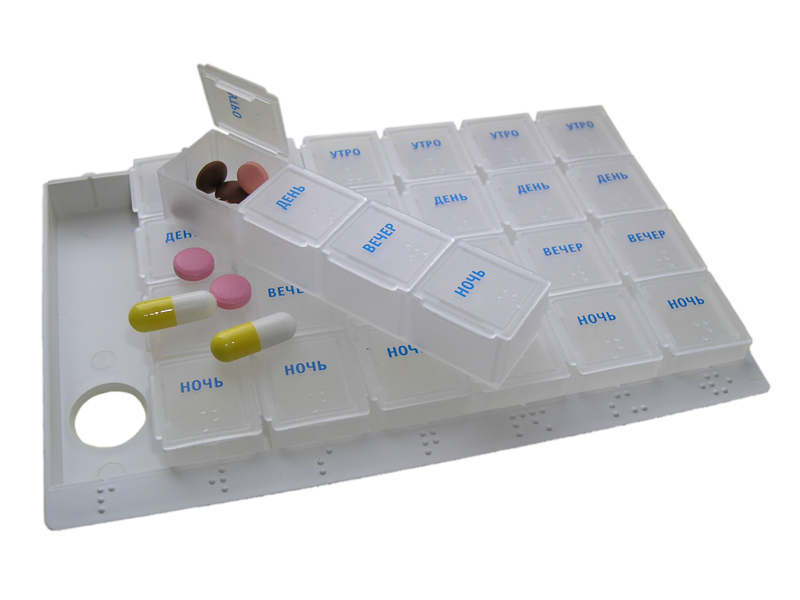 Каждый съёмный пенал имеет четыре секции, закрывающиеся отдельными крышками с нанесенными на них крупными, легко читаемыми надписями <<УТРО>>, <<ДЕНЬ>>, <<ВЕЧЕР>>, <<НОЧЬ>>.
